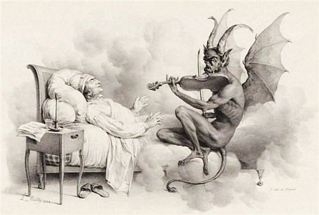 (Tartinis drøm: Fiolinvirituosen Guiseppe Tartini(1692 – 1770) skal visstnok ha blitt inspirert til sin Sonate i G, også kalt Devil´s Trill, av Djevelen selv i en drøm, her gjengitt av maleren Louis-Léopold Bouilly i 1824)