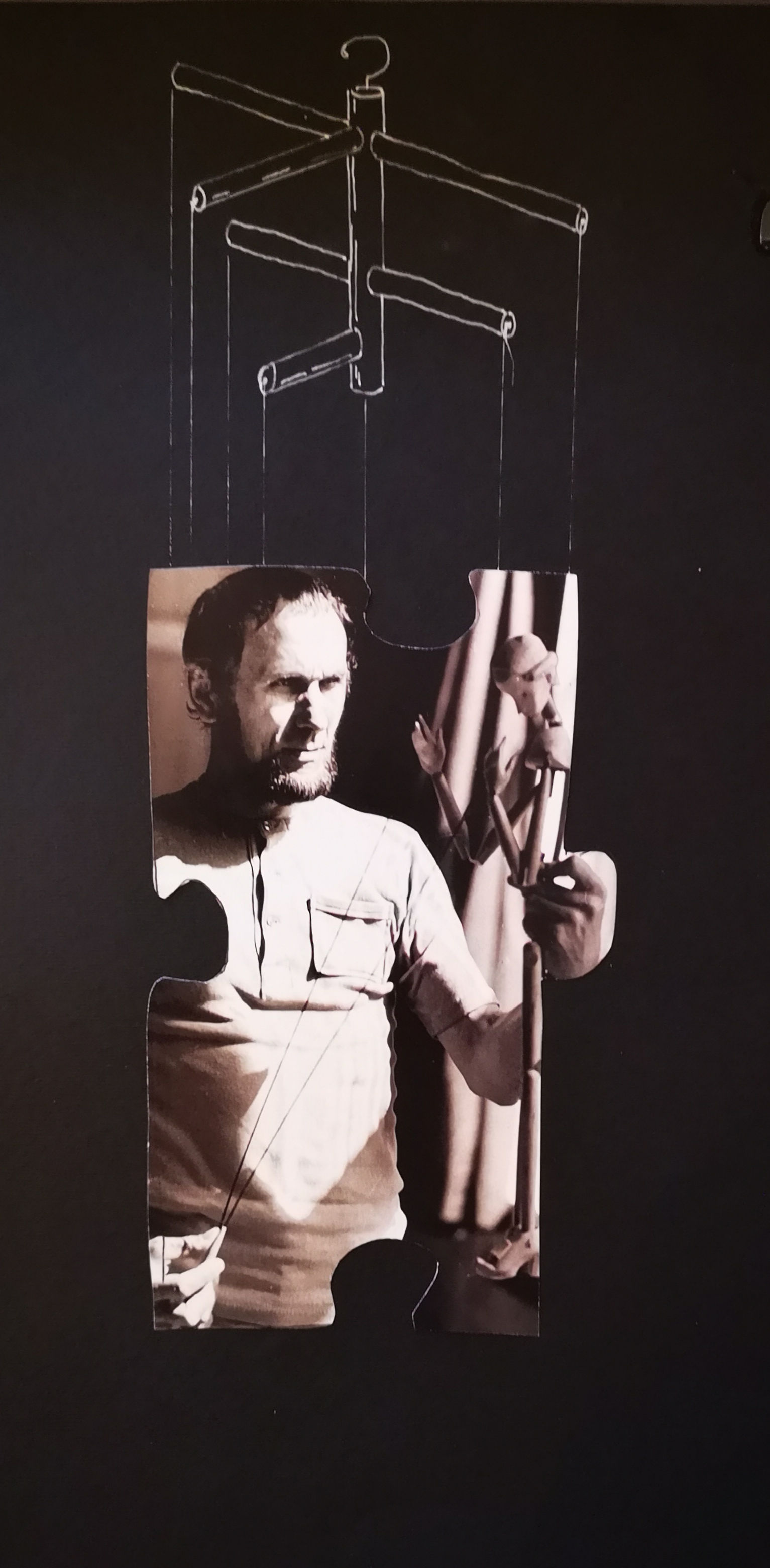 What does it do to a person to live with a sense that other people are constantly pulling the strings that governs your life? In my minds eye I see the 20-year old telegraphist and later marionette maker, theatre director and scenographer, crouching over the table and listening to the small taps from the telegraph lines spreading through Europe like a neural network. Lines connecting and controlling, and reaching all the way into Russia, – a young boy caught up in a life, a war and a net, where the person holding the string cross was forever hidden behind a wall of military brutality or the grey, closed faces of bureaucracy.